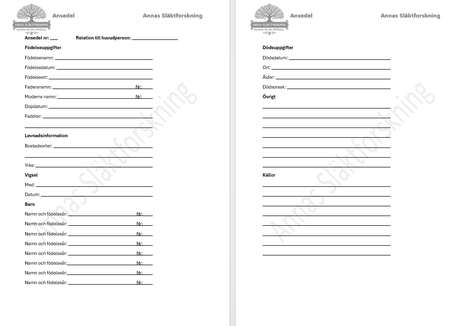 📖 Ansedelsmall – En tydlig och enkel mall för att samla viktig information om varje person i ditt släktträd, inklusive namn, födelsedatum, yrke, bostadsort och mycket mer. Denna mall är ett utmärkt verktyg för både nybörjare och erfarna släktforskare. Den hjälper dig att organisera din forskning och se till att inga viktiga detaljer går förlorade. Låt inte din familjs historia glömmas bort, börja samla in berättelser och dokumentera ditt släktträd redan idag!